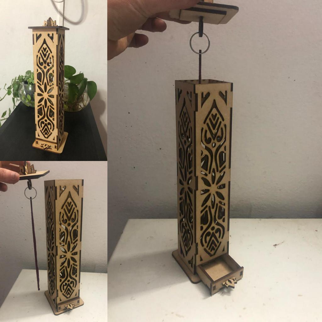 caja portasahumerio con tapa para colocar el sahumerio de forma vertical .